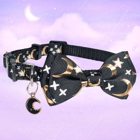 Midnight Moon – Black Celestial Bowtie Cat Collar (Adult Size)