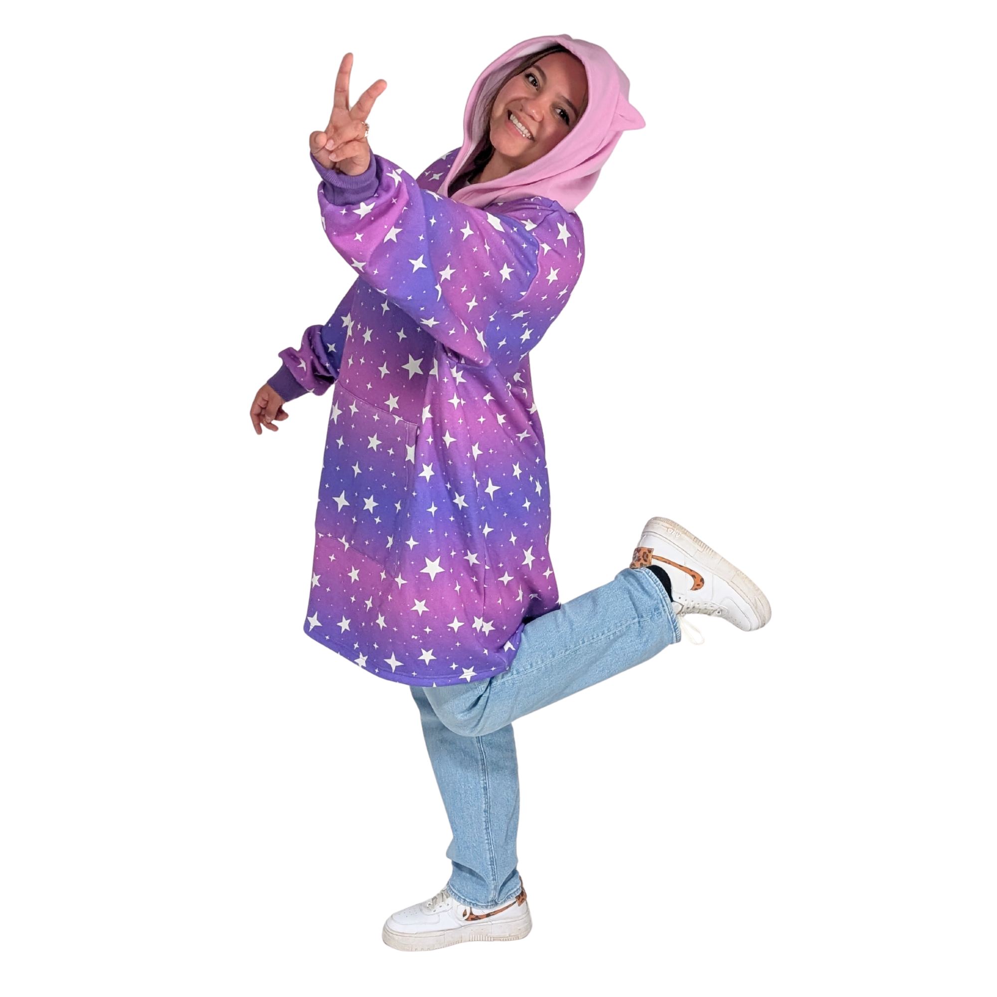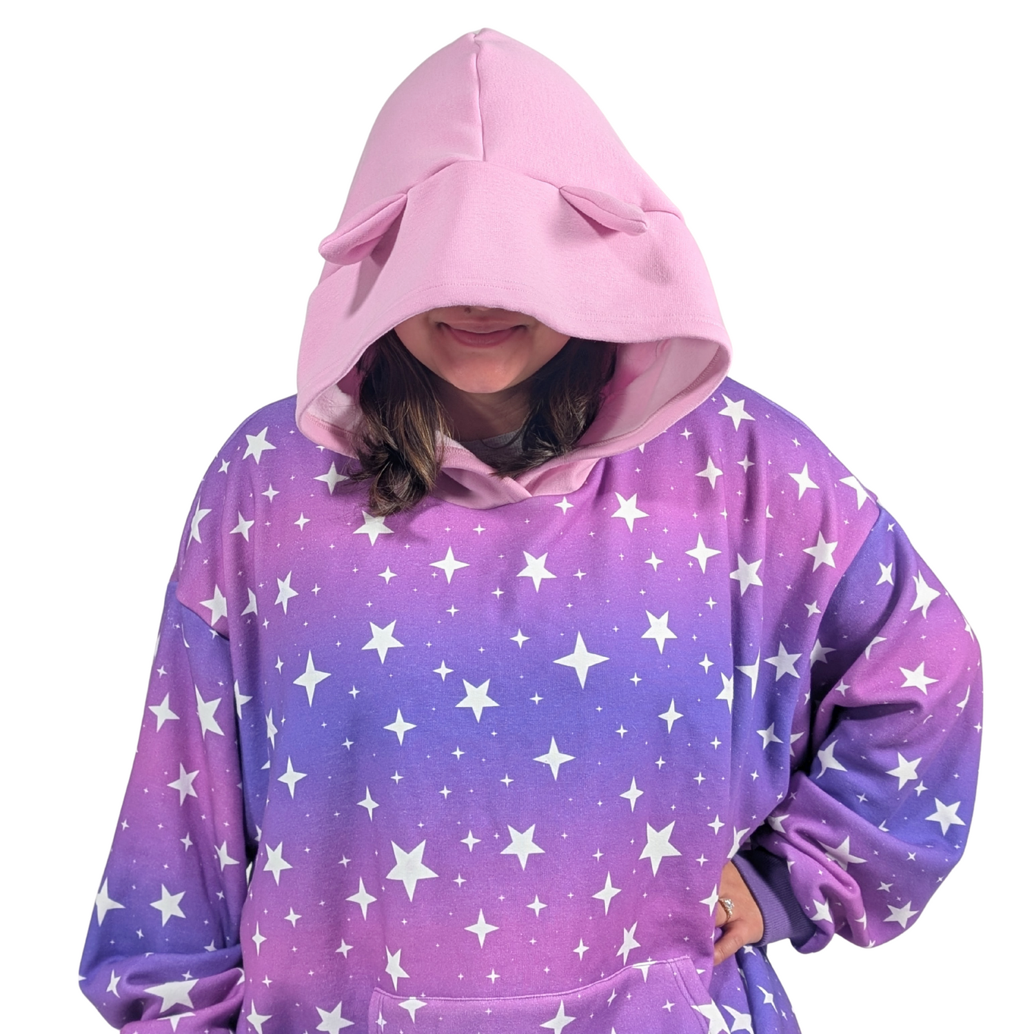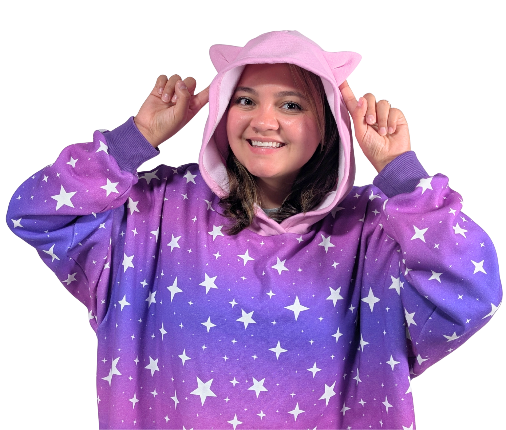 - Large Cat Ear Hood: cat-ear shaped hood in cotton candy pink that is roomy and comfortable
