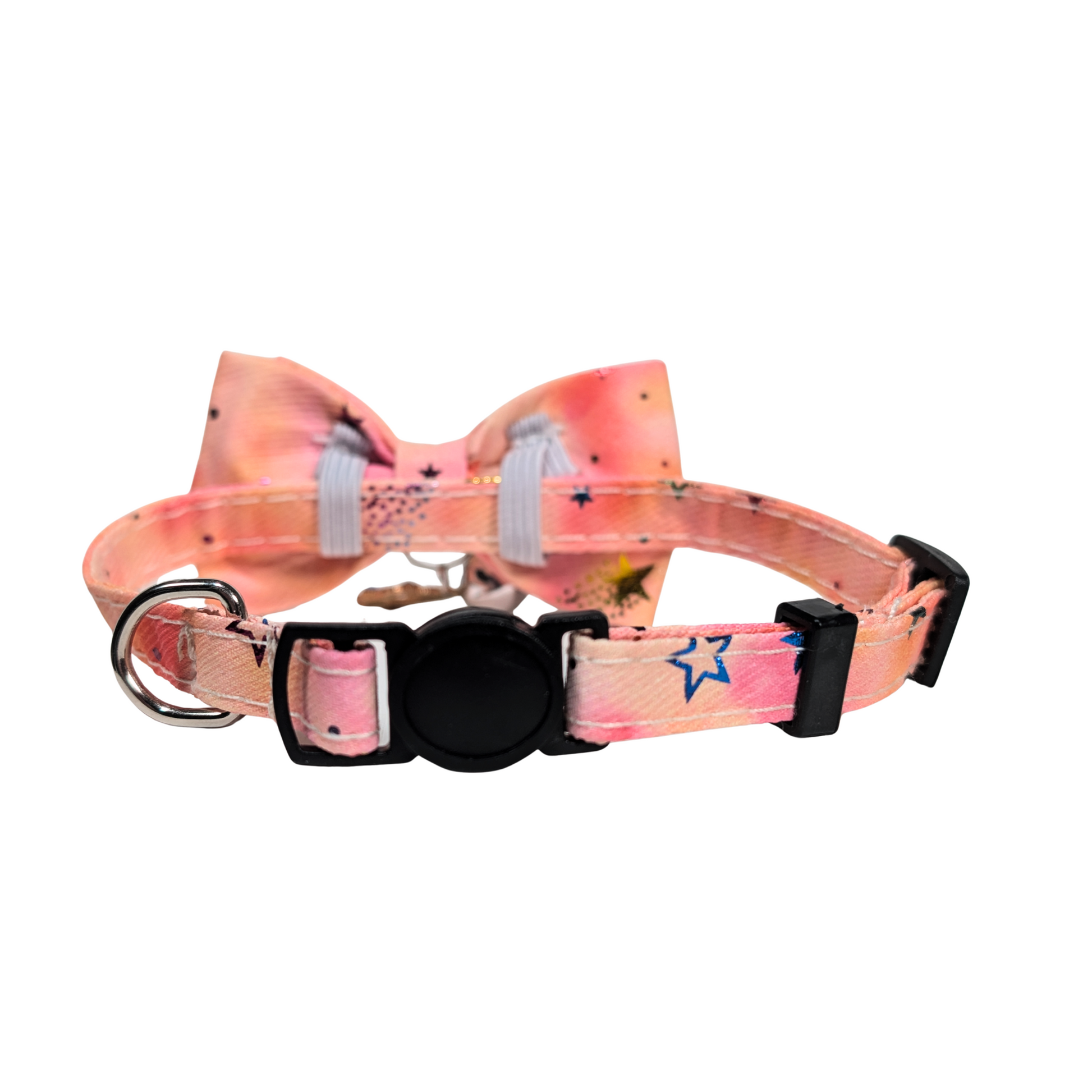 Soft as a sunset and dreamy as the stars — the Peach Dreamy Celestial Cat Collar captures the warmth of twilight skies. Crafted from a smooth polyester fabric printed with a pastel galaxy pattern, this collar features a soft bowtie, silver bell, and a golden moon & cloud charm that glows with gentle charm.